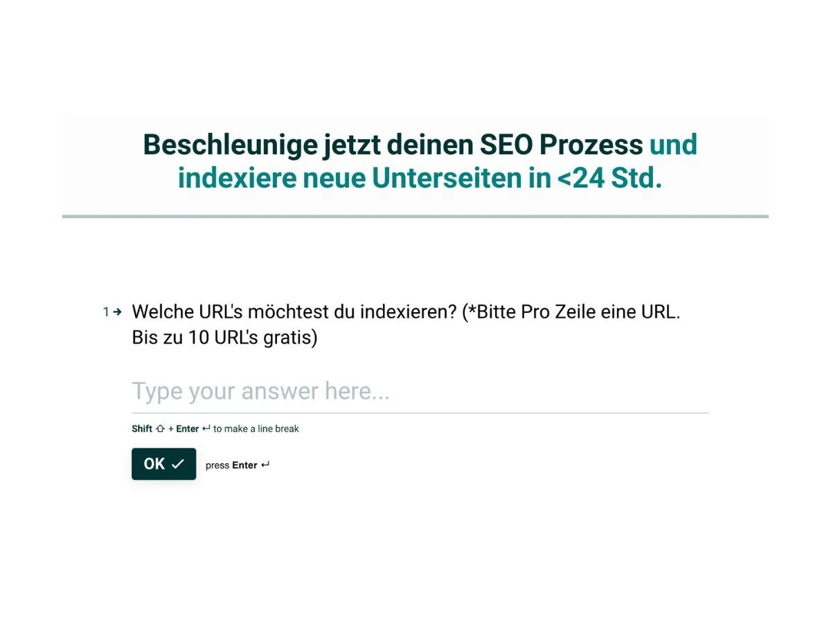 In einer Welt, in der schnelle Indexierung und hohe SEO-Rankings entscheidend sind, bietet Timo Spechts Tool eine unvergleichliche Lösung. Mit einer beeindruckenden Indizierungsrate von 90% innerhalb der ersten 24 Stunden ermöglicht dieses Tool einen schnellen SEO-Erfolg. Es ist ideal für alle, die ihre Online-Präsenz beschleunigen und ihre Sichtbarkeit in den Suchmaschinenergebnissen verbessern möchten.