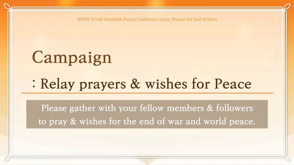 Zum Abschluss der Konferenz schlug HWPL durch den Moderator eine "StaffelGebetskampagne" vor. Religiöse Führungspersönlichkeiten wurden dazu ermutigt, fortlaufend Gebetstreffen für den Frieden abzuhalten und in verschiedenen Formen Gelegenheiten zu schaffen, um die Herzen so vieler Menschen wie möglich zu erreichen.