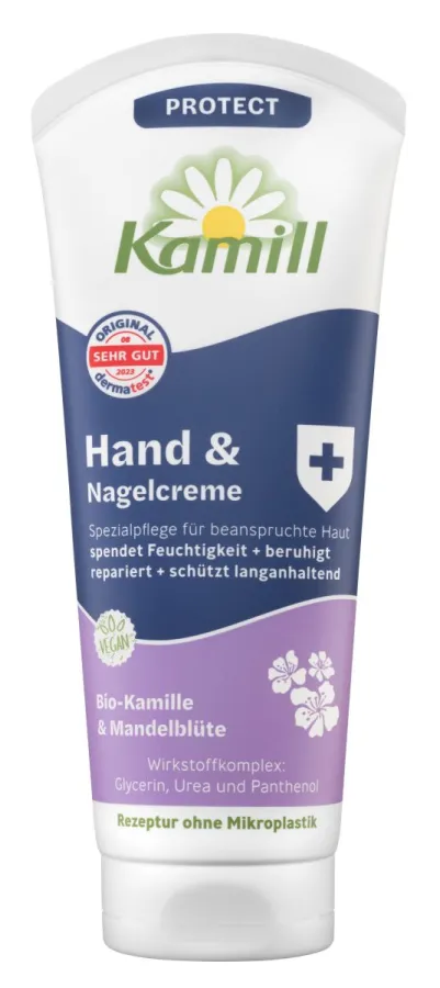 Die Pflegeformel ist speziell für normale bis trockene und beanspruchte Haut entwickelt. Sie spendet Feuchtigkeit, verbessert die Hautelastizität und beruhigt strapazierte Hände. Dabei ist sie nicht fettend und zieht schnell ein, wodurch ein sofortiges geschmeidiges Hautgefühl erzeugt wird. Der dezente und pflegende Duft rundet das Wohlfühlerlebnis ab. Wichtige Pflanzenextrakte wie Bio-Kamille und Mandelblüte bieten zusätzliche Vorteile: Die Kamille unterstützt die Zellregeneration und lindert Hautreizungen, während Mandelblüten für Feuchtigkeit und Beruhigung sorgen. Der enthaltene Wirkstoffkomplex aus Glycerin, Urea und Panthenol bindet die Feuchtigkeit, lindert Juckreiz und fördert die Wundheilung. Dabei ist die Kamill PROTECT frei von Farbstoffen, Parabenen, Silikon, Paraffinen und Mikroplastik und setzt auf eine vegane Rezeptur. Das Resultat ist ein langes, intensives Pflegegefühl, bei dem Risse und Fältchen sichtbar gemildert werden und die Haut glatter und straffer wirkt. Ein wahres Erlebnis für Handcreme-Nutzende jeder Altersklasse. Der UVP liegt für eine Tube mit der Größe 100ml bei 1,79 Euro.