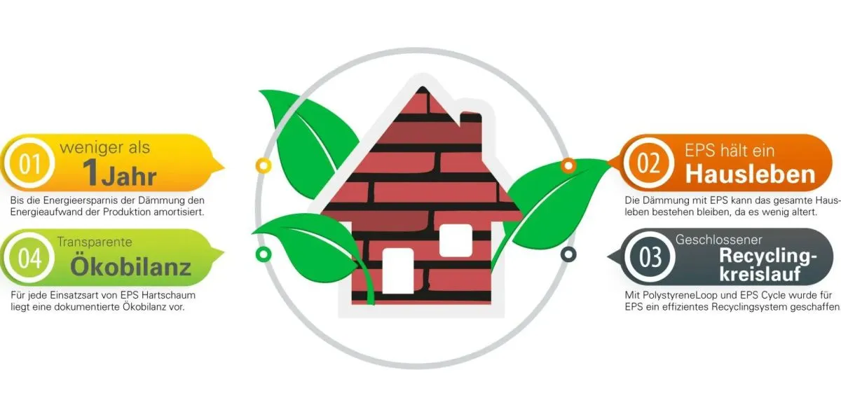 Nach 5 bis 8 Monaten hat der EPS-Dämmstoff seine Herstellungsenergie bereits amortisiert, also schon nach einer Heizphase. Dafür bleibt der Dämmstoff ein Hausleben an der Fassade und spart kostbare Heizenergie sowie CO2 ein.