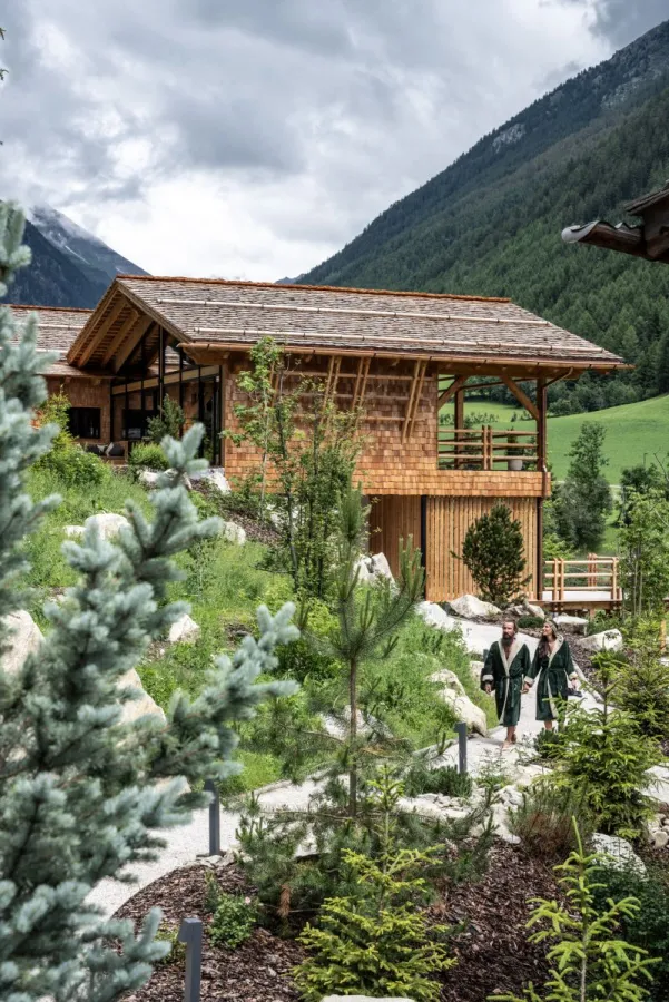 Die Naturchalets selbst strahlen die Kraft des Holzes nach außen wie innen ab. Die Fassade aus waldeigener Lärche und innen verkleidet mit Zirbe, deren Essenzen entspannen und für wohligen Schlaf sorgen.