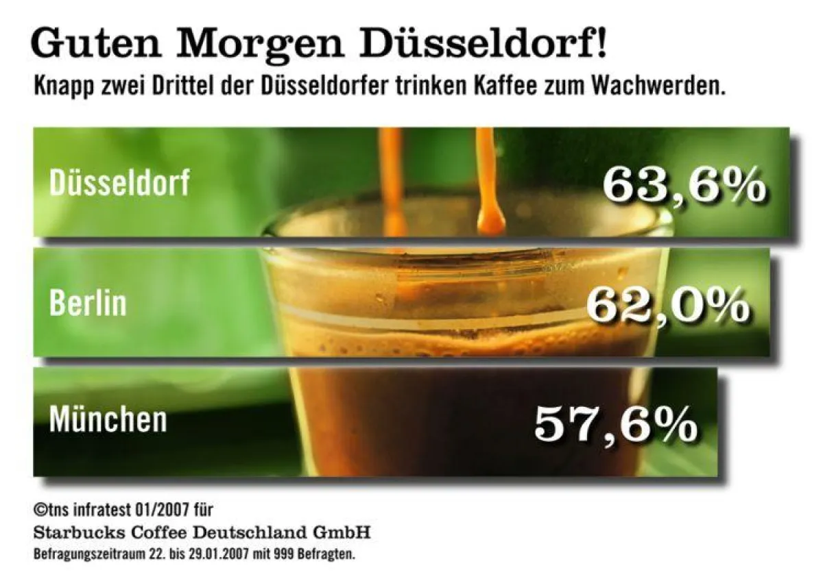Ende Januar 2007 wurde eine unabhängige, bundesweite Umfrage unter 999 Kaffeetrinkern ab 16 Jahren vorgenommen. Besonderer Fokus lag dabei auf den Städten Berlin, Düsseldorf und München als Vertreter ihrer Region. Starbucks wollte wissen, ob sich Kaffeetrinker in Nord-, Mittel-, und Süddeutschland in ihren Vorlieben unterscheiden und wer das größte Wissen in Sachen Kaffee hat.