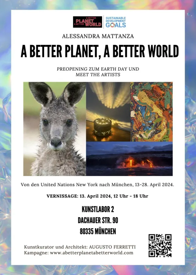 "A Better Planet, A Better World" in München, vom 13. bis 28. April 2024, wird sich mit der Natur, der Artenvielfalt und der Tierwelt beschäftigen. Einige Werke werden direkt aus der Kunstausstellung bei der UN in New York stammen, aber es wird auch eine Menge neuer Kunstwerke geben, die speziell für München geschaffen wurden: