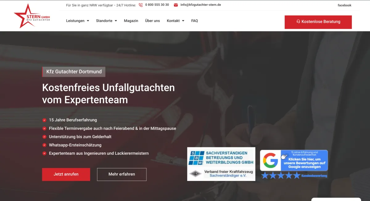 Die Kfz-Gutachter Stern GmbH in Dortmund erntet Lob von zufriedenen Kunden für ihre professionelle Dienstleistung und herausragenden Service. Mit zahlreichen positiven Bewertungen bestätigen Kunden die Qualität der Gutachten sowie die freundliche und kompetente Betreuung durch das Team.