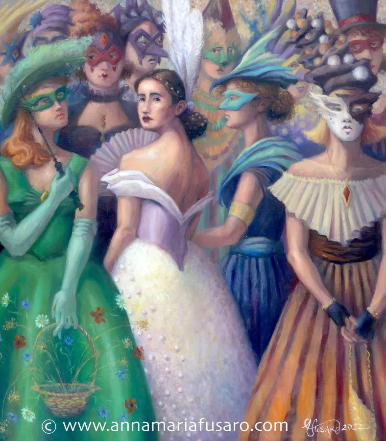 In der Ausstellung „Demaskerade“ zeigt Anna Maria Fusaro auf subtile Weise das Streben nach individueller Freiheit. Ihre Bilder, sensible Darstellungen verschiedener Gedanken und Ausdruck kreativer Intuition, spiegeln die Sehnsucht des Menschen nach körperlicher und geistiger Unabhängigkeit wider. Die Werke laden den Betrachter ein, über die Verstrickungen und Fesseln des Lebens nachzudenken und den Übergang zu einem selbstbestimmten und dynamischen Dasein zu feiern.