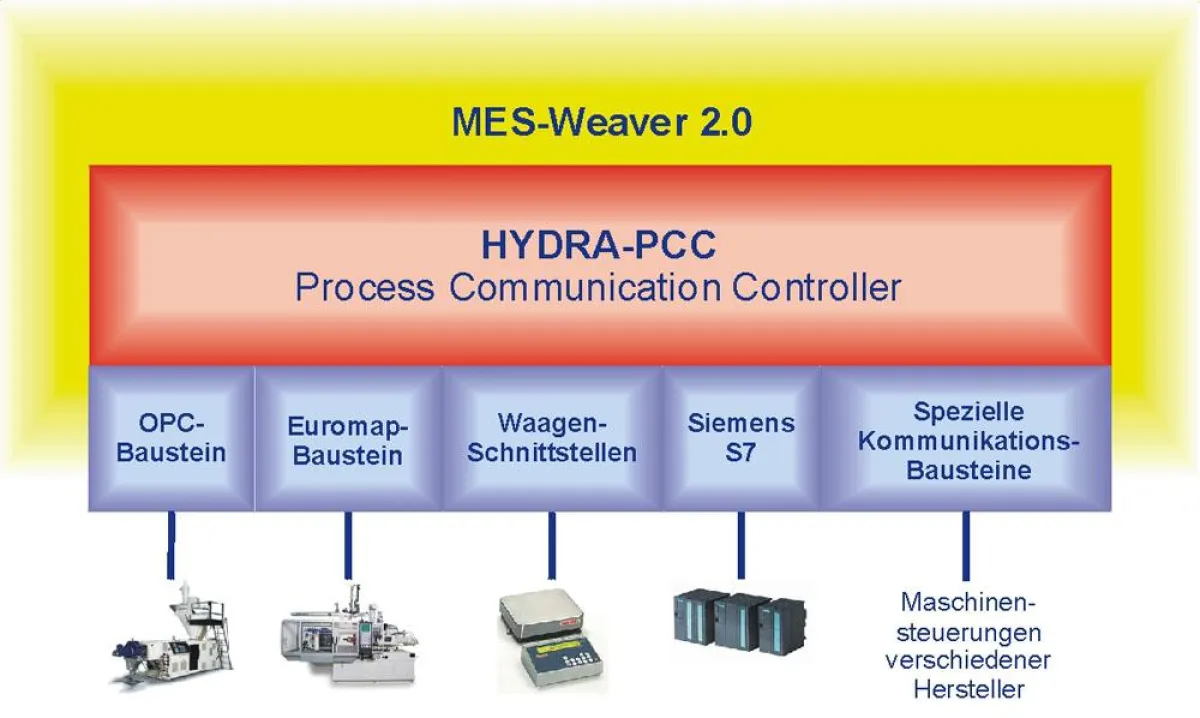 (openPR) Mit dem HYDRA Process Communication Controller (HYDRA-PCC) erweitert MPDV die Möglichkeiten der Maschinenanbindung zur automatischen Erfassung von Stückzahlen, Maschinenzuständen und Prozesswerten von Produktionsanlagen. Damit können die Daten direkt über die Kommunikationsbausteine zwischen HYDRA und der Maschine ausgetauscht werden. Dabei bietet der HYDRA-PCC bereits ein umfangreiches Standardangebot an Protokollen an. Dazu gehören beispielsweise: OPC-Bausteine (Steuerungen von Siemens S7, WAGO, Sinumerik, etc.), Euromap E63-Bausteine (eingesetzt bei der Kopplung zu Maschinen von Battenfeld, Engel-EMS, Krauss-Maffei, Demag, etc.), Waagen-Bausteine, serielle Anbindungen an Krauss-Maffei MC3, MC3F, MC4, Arburg Selogica, etc. oder Kopplungen über Arcnet und Profibus Darüber hinaus können auch spezielle Maschinensteuerungen mit dem neuen HYDRA-PCC einfach und schnell angebunden werden.