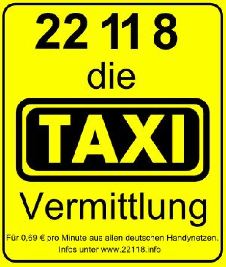 Mit der Kurzwahl 22 11 8 (gesprochen: zweiundzwanzig elf acht) steht dem Mobilfunk Nutzer jetzt eine einheitliche, unkomplizierte und kostentransparente Rufnummer zur Verfügung. Unsere Nummer ist in ganz Deutschland aus allen Handy Netzen zum einheitlichen Preis von 0,69 € pro Minute erreichbar. Zusatzkosten z.B. für eine Weitervermittlung fallen nicht an. Die Taxi-Auskunft und –Vermittlung 22 11 8 ist damit für den Mobilfunk Kunden günstiger als der Anruf bei einem der 118-er Auskunftsdienste.