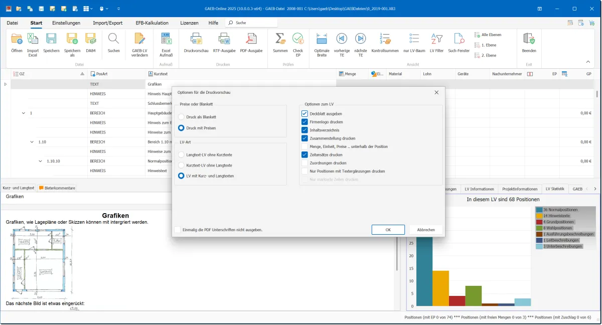 Auch die Druckfunktionen wurden erweitert, sodass sich Ausdrucke nun noch besser personalisieren lassen. Nutzer können beispielsweise ein Firmenlogo in ihre Ausdrucke integrieren und flexibel entscheiden, ob Zeitansätze oder Zuordnungen und Kostengruppen gedruckt werden sollen. Es ist zudem möglich, ausschließlich ausgewählte Bereiche oder Gliederungen in den Ausdruck aufzunehmen.