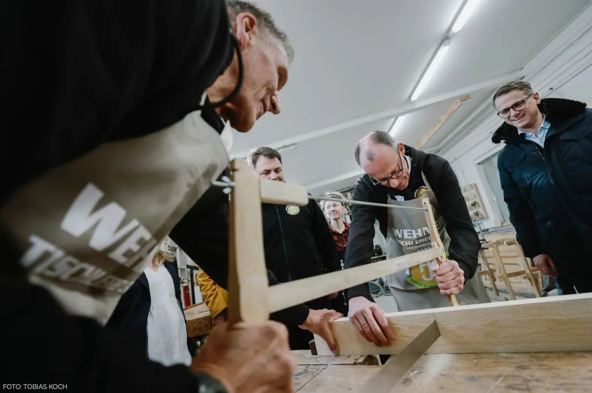 Bei dem Besuch der Berliner Tischlerei hatte Ralf Moeller Unterstützung von dem Kanzlerkandidaten der Union Friedrich Merz, ZDH-Präsident Jörg Dittrich, CDU-Generalsekretär Dr. Carsten Linnemann sowie Carola Zarth, Präsidentin der Handwerkskammer Berlin. Und es wurde fleißig gehobelt und gesägt. Denn beim Besuch legten der Hollywood-Schauspieler und Friedrich Merz mit Handsäge und Hobel Hand an und tauschten sich mit den Lehrlingen des Betriebs über die Herausforderungen und Chancen einer Ausbildung im Handwerk aus.
