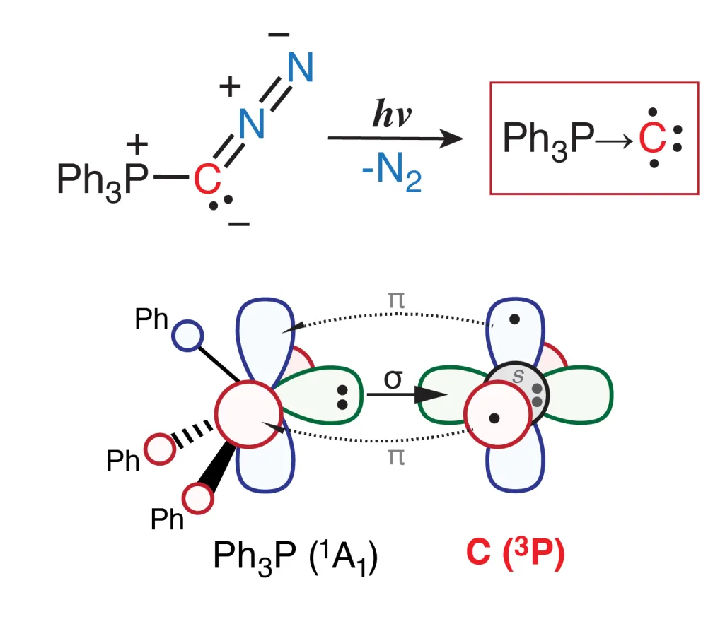 In einer wegweisenden Studie, veröffentlicht in Angewandte Chemie, berichten die Forscherteams um Dimitrios A. Pantazis (MPI für Kohlenforschung, Abteilung Molekulare Theorie und Spektroskopie), Müge Kasanmascheff und Max M. Hansmann (TU Dortmund) über die Entdeckung einer Verbindung, in der ein einzelnes Kohlenstoffatom an eine Phosphorgruppe gebunden ist: Ph₃P→C. Diese Verbindung wurde durch Bestrahlung eines Diazophosphorylid-Vorläufers mit ultraviolettem (UV) Licht bei sehr tiefen Temperaturen erzeugt, was zur Abspaltung von N₂ und zur Bildung von Ph₃P→C führte.