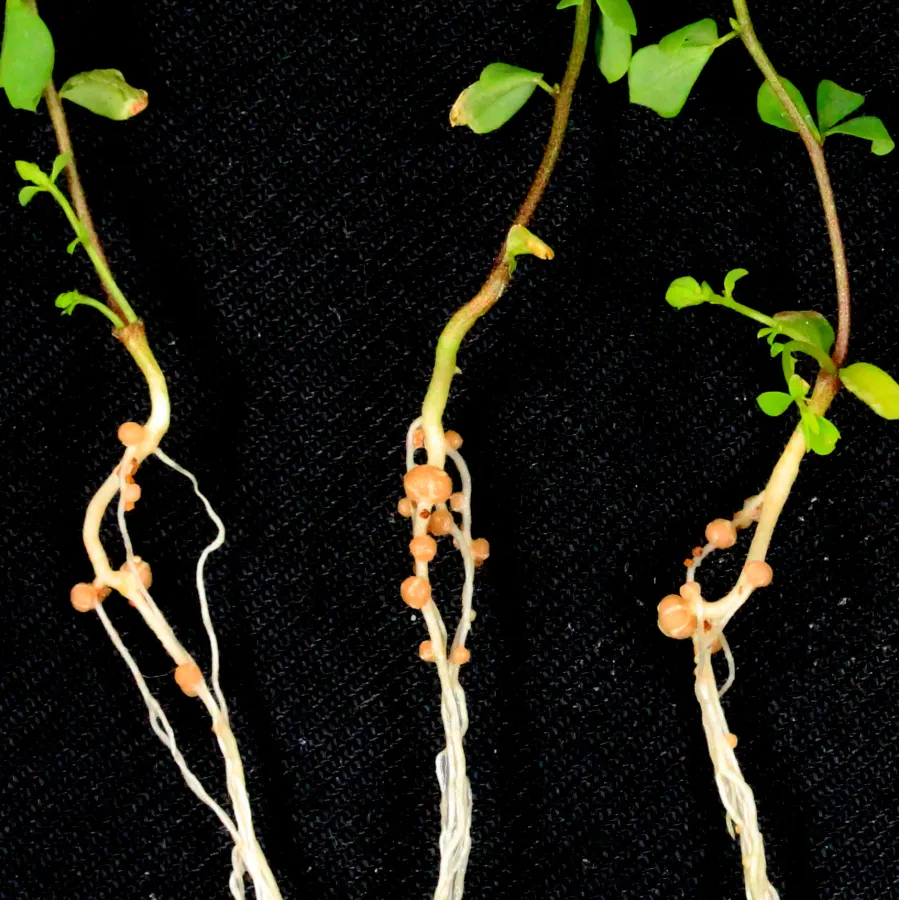 Die Knöllchenbildung ist kein Zufall, sondern wird streng reguliert, je nachdem, wie viel Stickstoff im Boden vorhanden ist. Ist zu wenig Stickstoff vorhanden, senden die Wurzeln ein Notsignal (ein Peptid namens CEP1) an die Blätter, wodurch das Gen ‚Too Much Love‘ (TML), welches die Knöllchenbildung blockiert, ausgeschaltet wird. Dadurch kann die Pflanze nun Knöllchen bilden und mehr Stickstoff aufnehmen. Es ist wie ein gut organisierter Gruppenchat, in dem alle über die Stickstoffkrise auf dem Laufenden sind.