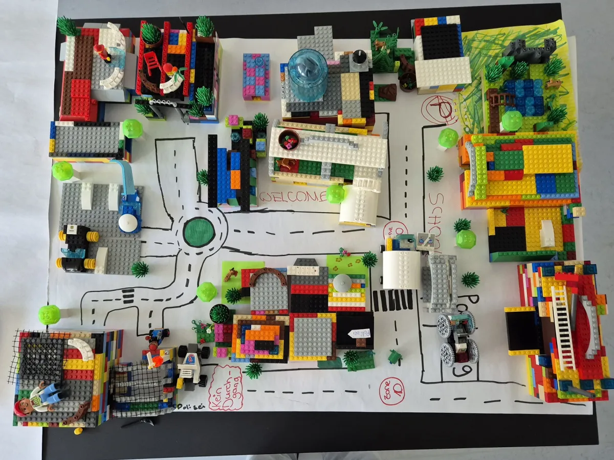 Zu Beginn sammelten die Teilnehmerinnen Ideen für Gebäude, die in der neuen Stadt entstehen sollten. Vom Krankenhaus bis zum Rathaus, vom Kindergarten bis zum Geschäft – mit viel Fantasie wurden die Vorstellungen gemeinsam konkretisiert. Nach einer ersten Schätzung des Aufwands ging es in mehreren Bauphasen, sogenannten Sprints, an die Umsetzung. Zum Einsatz kamen LEGO-Steine, Papier und viele andere Materialien, die die Hochschule zur Verfügung stellte.