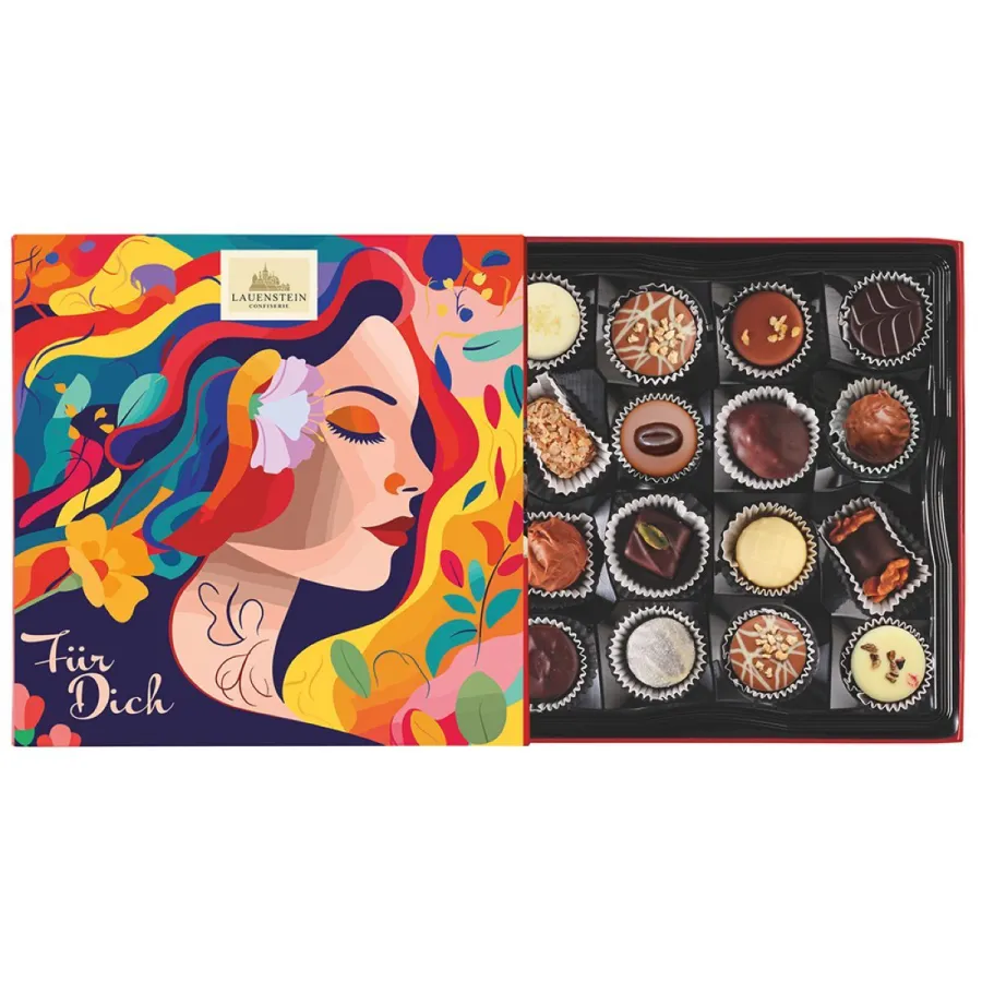 Die neue "Für Dich"- Linie mit zwei verschiedenen Trüffel- und Pralinenauslesen ist der jüngste Entwurf des Design-Teams und schmückt die beliebtesten Lauensteiner Kreationen mit einem farbenfrohen Cover, dessen Illustration an eine Mischung aus Jugendstil-Ästhetik und moderner Pop-Art erinnert. Das Motiv zeigt eine stilisierte Frau mit geschlossenen Augen, ihr Haar fließt in komplementären Farbtönen, durchzogen von Blüten und Blättern. Die geschwungene Schrift "Für Dich" fügt sich harmonisch in das träumerische Bild ein und unterstreicht die liebevolle Botschaft.