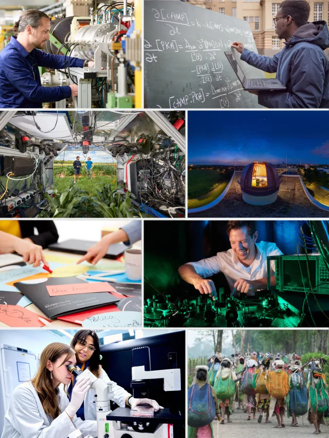 Struktur und Entwicklung des Universums werden durch unzählige Phänomene gesteuert, die auf sehr verschiedenen Zeitskalen von Sekundenbruchteilen bis zu Milliarden von Jahren ablaufen. Der gemeinsam mit der Universität zu Köln getragene Exzellenzcluster Our Dynamic Universe verbindet die astrophysikalischen Prozesse durch eine Kombination aus Beobachtungen mit neuer Instrumentierung, Theorie in Verbindung mit neuartigen Simulations- und datenwissenschaftlichen Methoden und Laborastrophysik. Ziel ist, die Zeitentwicklung des Materie- und Energieflusses vollständig zu beschreiben. In der Region Bonn-Köln ist die Cluster-Initiative in einem international anerkannten Kompetenzzentrum insbesondere für Radioastronomie angesiedelt, gestützt auf vier Säulen: (1) Bau von hochmodernen Detektoren und Instrumenten für internationale Teleskope, (2) Leitung groß angelegter Beobachtungsprogramme, (3) Betrieb eines Weltklasse-Labors für Astrophysik und (4) Simulation der dynamischen Entwicklung von Planeten, Sternen und Galaxien auf Hochleistungscomputern.