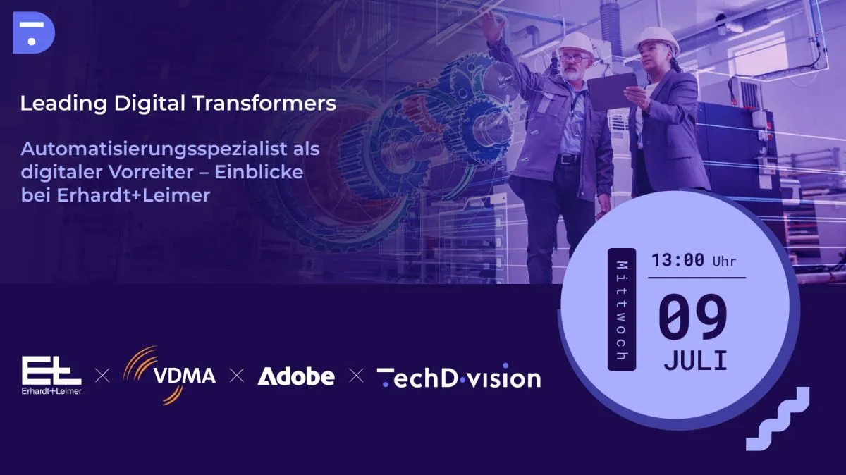 Am 9. Juli 2025 lädt die Erhardt+Leimer Group gemeinsam mit dem VDMA und TechDivision zu einem exklusiven Vor-Ort-Event unter dem Motto "Leading Digital Transformers" in die Unternehmenszentrale nach Stadtbergen bei Augsburg ein. Die Veranstaltung richtet sich gezielt an Entscheiderinnen und Entscheider aus dem Maschinen- und Anlagenbau, sowie verwandte B2B-Branchen, die sich praxisnah mit den Chancen und Herausforderungen der digitalen Transformation befassen wollen.