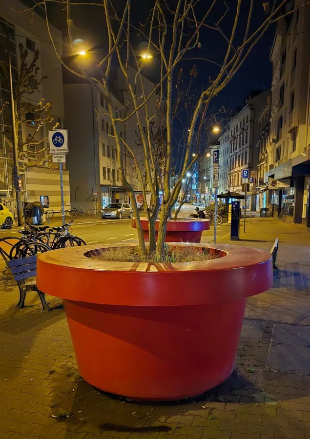Große rote Pflanzkübel von Schmutz, Stickern und Farbschmierereien befreit.