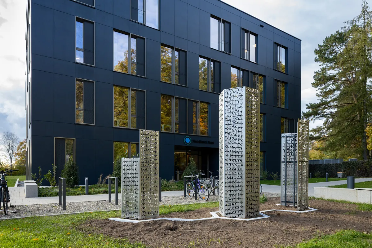 Zusammen mit den rund 60 geladenen Gästen konnte die Stiftung Dr. Barbara Mez-Starck noch eine weitere Ehre erweisen. Vor dem Gebäude am Ulmer Oberberghof 7 wurde eine Skulptur in Gedenken an die Stifterin und ihr Lebenswerk eingeweiht. Drei mit Edelstahlplatten verkleidet Säulen repräsentieren die Arbeit von Dr. Barbara Mez-Starck ab den 1950er Jahren: den Starck-Katalog für Mikrowellenforschung, aus dem die Datenbank MOGADOC hervorging, die Spektren, Molekülstrukturen und Literaturquellen verknüpft, und noch heute verwendet wird.