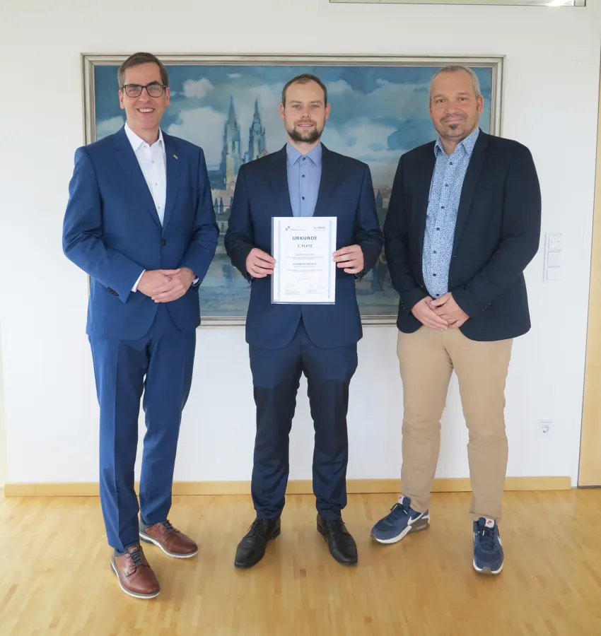 Prof. Dr. Ralph Schneider, Präsident der OTH Regensburg, gratulierte gemeinsam mit Prof. Dr. Thomas Schratzenstaller, Leiter des Labors für Medizinprodukte und Doktorvater, dem Preisträger Alexander Bartsch persönlich.