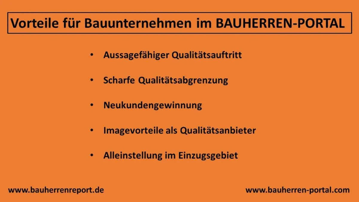 Mit einem digitalisierten, aussagefähigen Qualitätsprofil im BAUHERREN-PORTAL generieren die dort gelisteten Bauunternehmen weithin sichtbare Inhalte. Diese sind relevant für deren scharfe Qualitätsabgrenzung von Wettbewerbern. Zudem stimulieren sie als geprüfte Qualitätsanbieter zusätzliche Kontakte mit qualifizierten Bauinteressenten.
