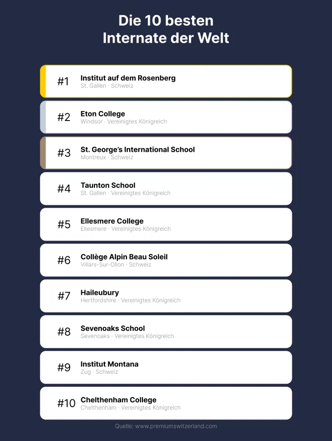 Schweizer Schulen sind durchgängig prominent in den Top 20 vertreten. Neben dem Institut auf dem Rosenberg auf Platz 1 erreichen Schulen wie St. George's International School, Collège Alpin Beau Soleil, Institut Montana, Aiglon und Institut Le Rosey starke Positionen im Gesamtranking.