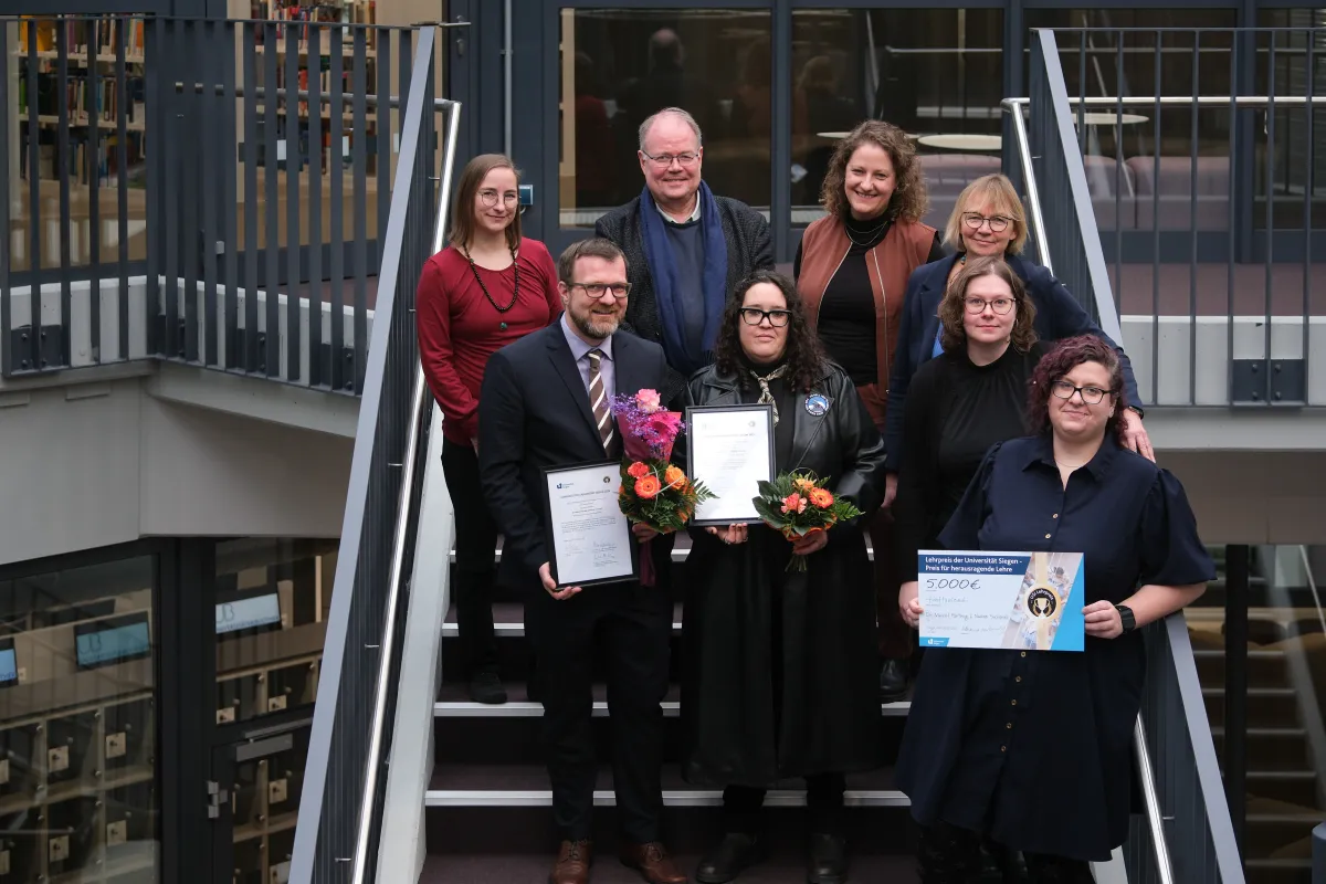 Ein besonderer Moment am Tag der Lernkulturen war die Verleihung des Lehrpreises der Universität Siegen 2025. Ausgezeichnet wurden Dr. Marcel Hartwig und Nadine Sucharda, die die Theatergruppe „Desperate Thespians“ leiten und mit ihrem kreativen Ansatz und innovativen Lehrmethoden ein herausragendes Beispiel für ein Format ist, das die Studierenden begeistert, in ihrer Entwicklung begleitet und prägend für die Studienzeit ist.