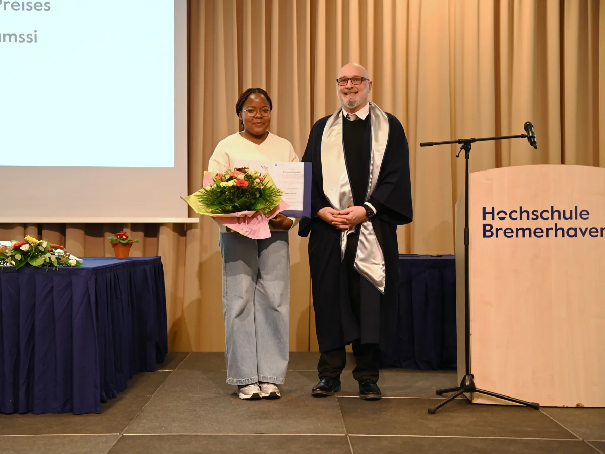 Obwohl Grace Danielle Matcheu Youmssi einen Studienplatz an drei Hochschulen angeboten bekam, entschied sie sich für Bremerhaven. „Eine Freundin von mir lebt hier und ich dachte, es sei besser, nicht ganz allein in einer neuen Stadt zu sein“, erklärt sie. Wie viele internationale Studierende stand auch sie zunächst vor der Herausforderung, mit Sprachbarrieren umzugehen. Da ihre Muttersprache Französisch ist, halfen auch englische Übersetzungen nicht weiter. Dies hat sie dazu bewegt, sich im Studium besonders zu engagieren und Kontakt zu ihren Kommiliton:innen und Lehrenden zu suchen: „Es ist für Internationals schwierig, wenn man immer nur für sich bleibt. Besonders, wenn man eigentlich die Sprache lernen möchte. Daher wollte ich nicht nur gern eine gute Beziehung zu den anderen Studierenden, sondern auch zu den Lehrenden.“ Auf diese Weise vernetzte sie sich nicht nur gut innerhalb ihres Studiengangs, sondern absolvierte auch ihr Studium bisher erfolgreich und fiel dabei durch sehr gute Leistungen auf.