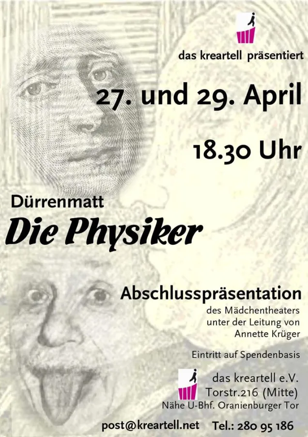 Berlin, 10. April 2007 - Sechs Mädchen zwischen 13 und 17 Jahren zeigen am 27. und 29. April 2007, jeweils um 18.30 Uhr, im kreartell e.V. ihre Inszenierung von „Die Physiker“. Diese skurrile Inszenierung bearbeitet mit Witz und Ernst und Spielfreude die Themen Liebe, Menschlichkeit und Verantwortung gegenüber der Welt. Am Ende ist nichts so, wie es zu Beginn schien.