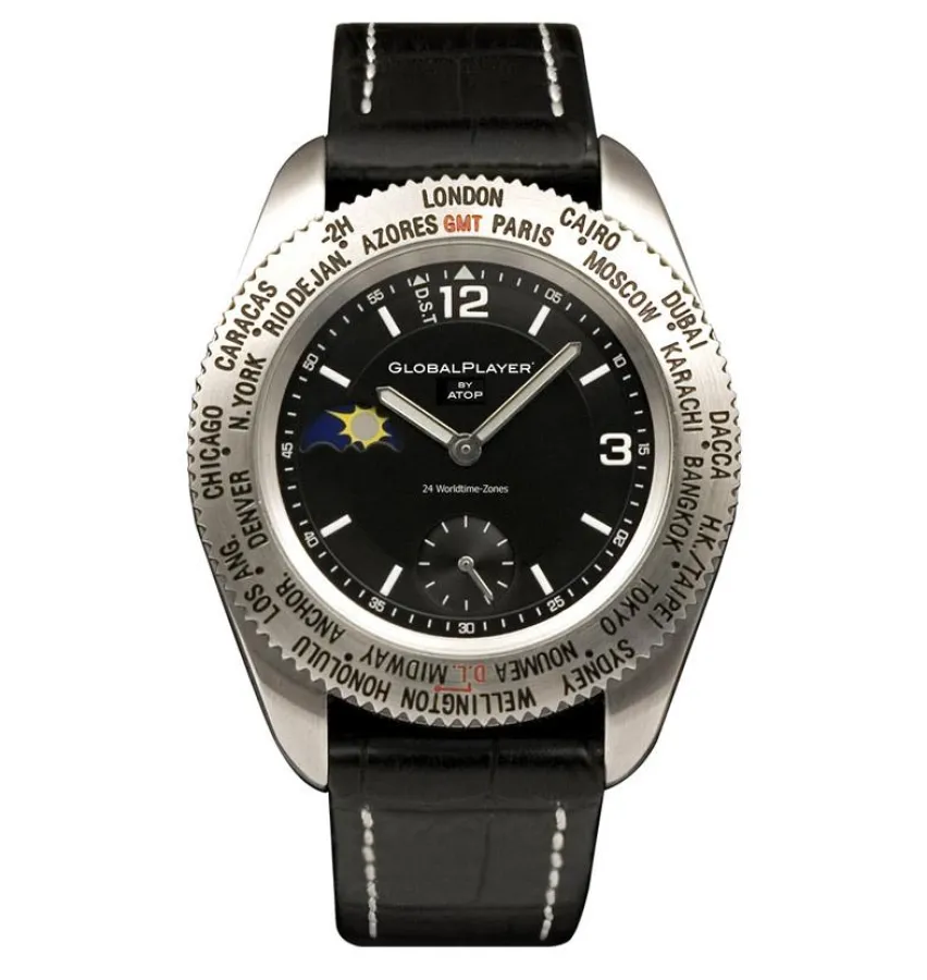 Warum diese Uhr in der Kategorie Produktdesign ausgewählt wurde? Das Besondere ist eine Drehlünette mit allen Welt-Zeitzonen. Durch einfaches Drehen des Rings, justieren sich die Zeiger der Uhr durch die einzigartige, patentierte Mechanik automatisch auf die Lokalzeit einer der 24 eingravierten Weltstädte. Gleichzeitig zeigt das Sonne/Mond-Symbol den Verlauf der Sonne vor Ort. „Die Uhr ist für den international tätigen Geschäftsmann perfekt geeignet, denn man weiß immer ob man den entscheidenen Anruf noch tätigen kann. Und auch bei dicht gedrängten Reiseplänen, hilft die Global Player zeitlich immer up to date zu sein“, weiß Hartmann. Die hochwertige Uhr hat ein Gehäuse aus Edelstahl, feuergehärtetes Mineralglas und ein Armband aus geprägtem Rindsleder. www.touchmore.de