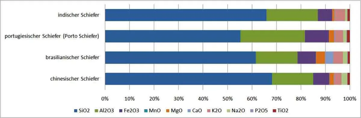 Betrachtet man Schiefer nur aus chemischer Sicht stellt sich schnell heraus, dass die Schiefer Arten doch recht unterschiedlich sind (s. Abbildung). Diese Unterschiede sind geprägt durch die Bildungsgeschichte der Schiefer. Da die chemische Zusammensetzung der Schiefer bedacht werden muss, um eine fachgerechte Verlegung durchzuführen, ist es zwingend notwendig diesen Aspekt zu analysieren und zu vergleichen.