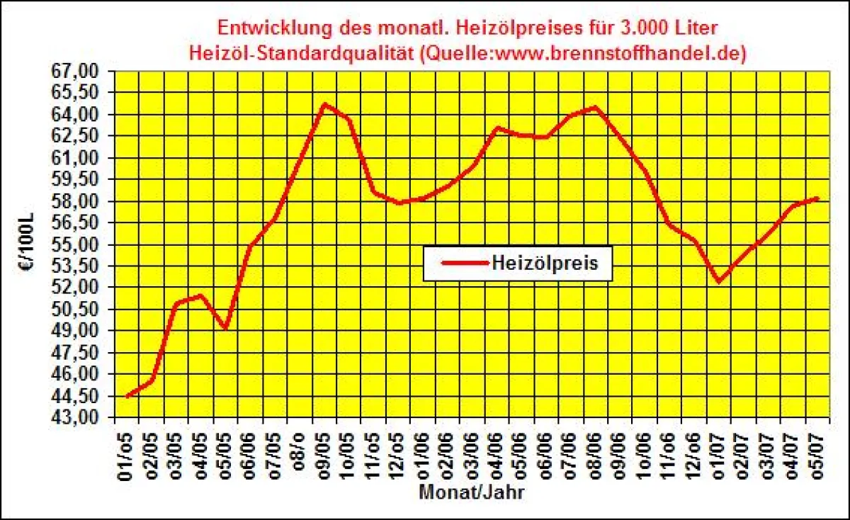Seit Januar 2005 war bisher der September 2005 mit einem Durchschnittspreis von 64,70€/100Liter (absolut:1941,00 Euro) bezogen auf eine Abnahmemenge von 3000 Litern Heizöl-Standardqualität der teuerste Monat für den Heizöleinkauf in Deutschland.