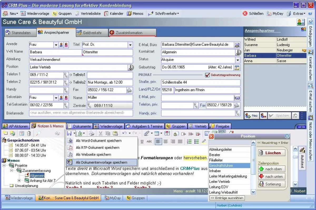 Joachim Berz, Inhaber der für CRM-Plus verantwortlichen Firma JBSoftware: "Die Arbeitsweise von CRM-Plus lässt sich an einem Beispiel ganz leicht erklären. Vor einem anstehenden Telefongespräch mit einem wichtigen Geschäftspartner wird einfach der entsprechende Eintrag in CRM-Plus aufgerufen. Er verrät Name und Adresse der Person, nennt noch ausstehende Termine und weist akribisch genau auf alle bereits stattgefundenen Kontakte hin. Außerdem werden alle Dokumente gelistet, die mit der Person in Verbindung stehen, also etwa die Korrespondenz und die Verträge. Zugleich verwaltet das Programm auch alle ausgetauschten E-Mails. Wenige Augenblicke reichen also aus, um alle wichtigen Fakten zu rekapitulieren. Perfekt vorbereitet kann der Benutzer dann zum Telefon greifen."