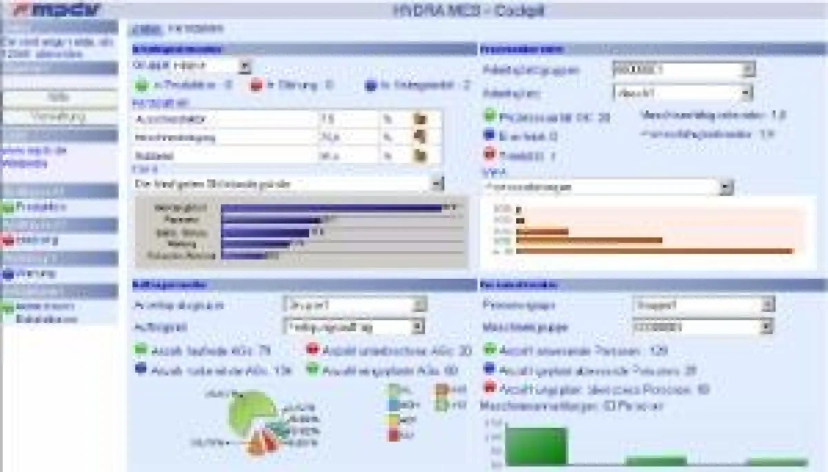 Auf der Einstiegsseite erhält der Anwender umfassende, stark verdichtete Schlüsselinformationen aus mehreren Bereichen. Zu jedem Bereich erhält der User auf Knopfdruck detaillierte Einzelinformationen in Form von Listen, Auswertungen, Kennzahlen, usw., deren Detaillierungsgrad zunimmt je tiefer der Anwender in die Ebenen eindringt (Drill Down). Dabei kann der Anwender individuell entscheiden, wie er die Kennzahlen gestalten möchte. Durch die beliebige Anordnung von Elementen aus dem MES-Bereich sind Korrelationen möglich. Das HYDRA MES-Cockpit zeigt Trends und Zieldefinitionen an. Die in den Zieldefinitionen festgelegten Grenzwerte werden permanent überwacht. Sobald diese Grenzwerte erreicht oder gar überschritten werden, leitet das HYDRA-Eskalationsmanagement sofort eine Eskalation ein. Alle Kennzahlen und Auffälligkeiten werden im HYDRA MES-Cockpit grafisch visualisiert. Individuell definierbare Favoriten ermöglichen einen Schnellzugriff aus allen Navigationsebenen auf die wichtigsten, am häufigsten genutzten Informationen des Anwenders.