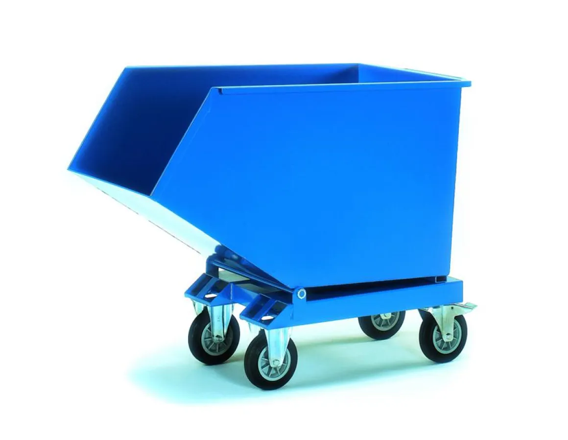 Für den Transport von Spänen und anderen Kleinabfällen, die in der Produktion anfallen, eignet sich der fetra-Muldenkipper optimal. Der Muldenkipper wird direkt unter dem Auswurfschacht der entsprechenden Maschine platziert. Sobald er befüllt ist, kann der Kipper schnell und sicher zur Entsorgungsstelle transportiert werden. Das Transportgerät verfügt über eine kippbar gelagerte Mulde aus 2 mm starkem Stahlblech, die öldicht verschweißt ist. Jeweils zwei Lenk- und Bockrollen mit Vollgummibereifung sowie Feststeller an den Lenkrollen (gemäß EN 1757-3) gewährleisten die notwendige Beweglichkeit und Sicherheit. Für die stationäre Nutzung auf einem Stapler ist der Kipper auch ohne Rollen erhältlich. fetra bietet den Wagen in vier verschiedenen Abmessungen und mit einem Fassungsvermögen von 250 bis 800 Litern an. Müssen beispielsweise Flüssigkeiten und Feststoffe getrennt werden, kann der Muldenkipper optional mit einem Ablasshahn mit Sieb ausgestattet werden.