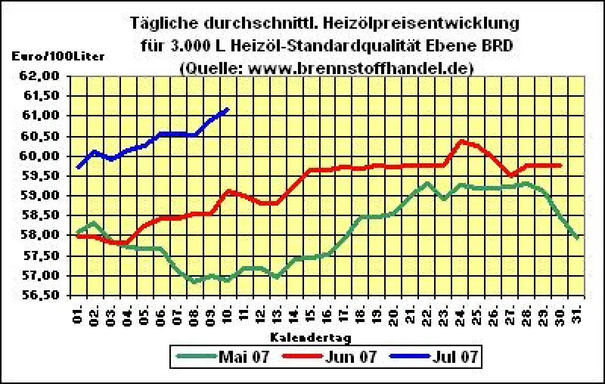 Am 10. Juli 2007 hat sich der durchschnittliche Heizölpreis für Heizöl der Sorte Standardqualität bezogen auf eine Abnahmemenge von 3.000 Litern auf Ebene BRD gegenüber dem Vortag von 60,56 Euro pro 100 Liter auf 61,17 Euro pro 100 Liter erhöht. Eine 3.000 Liter-Partie der Sorte Heizöl-Standardqualität kostet somit aktuell 1.835,10 Euro, wobei regionale Abweichungen möglich sind.