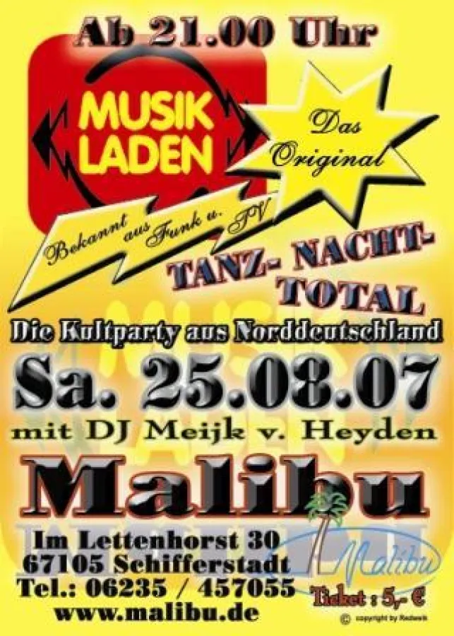 (openPR) Der MUSIKLADEN gastiert am Samstag, den 25. August 2007 im "Malibu" in Schiffestadt, Im Lettenhorst 30. Auf dem Programm steht eine Tanz Nacht Total, die Kultparty aus Norddeutschland, bei der DJ Meijk v. Heyden die Tanzfläche zum beben und die Gäste zum Schwitzen bringen wird. Die Veranstaltung beginnt um 21.00 Uhr, der Eintritt beträgt 5,- €.