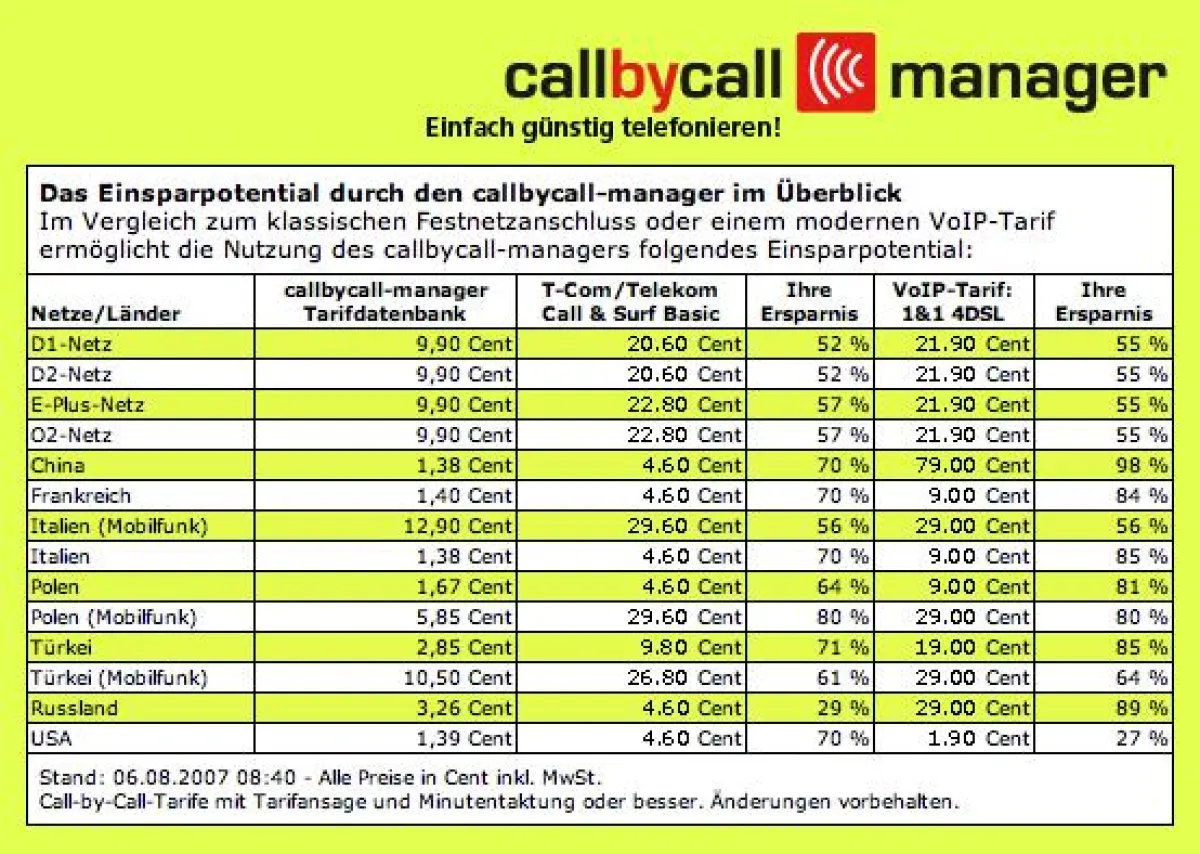 Die individuelle Ersparnis ist abhängig vom aktuellen Telefon-Tarif und kann unter http://www.callbycall-manager.de/tarifrechner ermittelt werden.