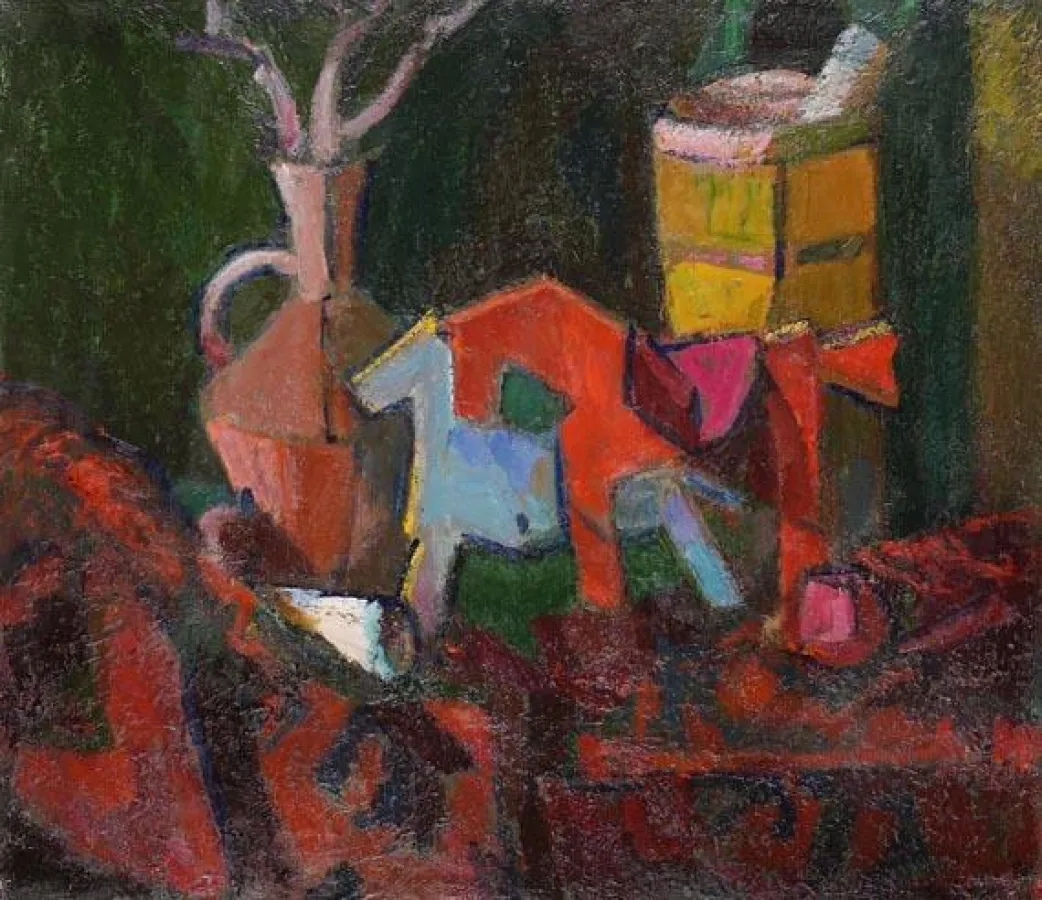 Werke von Moses (Moisej Aleksandrovich) Fejgin finden sich unter anderem im Russischen Museum in St. Petersburg, in der Tretjakov-Galerie und im Museum für moderne Kunst in Moskau sowie in internationalen Privatsammlungen. Fejgin ist mit seinen 103 Jahren eine der außergewöhn-lichsten Persönlichkeiten des russischen Kunst-betriebs und repräsentiert als einer der letzten Vertreter der Avantgarde fast ein Jahrhundert russischer Kunst. Auch sein 1985-87 entstandenes Ölgemälde entsteht in einem längeren Arbeitsprozess. In der ansatzweisen Zerlegung der Perspektive verweist es auf die künstlerischen Anfänge des Warschauer Malers, die in der Tradition des Moskauer Cézannismus der Künstlervereinigung “Karo-Bube” liegen. Mit der intensiven, aus sich selbst heraus leuchtenden Farbigkeit dagegen schöpft er mehr aus seiner abstrakt-expressiven Phase. Die bemalten, leicht folkloristischen Holzpferde hat der Künstler selbst geschaffen. Sie erinnern an Fejgins Kavallerie-Zeit und seine allgemeine Affinität zu Pferden, der er in seinen Werken immer wieder gerne Ausdruck verleiht.