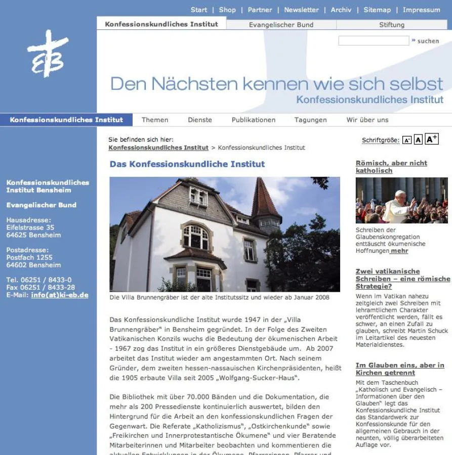 (openPR) Frankfurt, Oktober 2007 - Die Agentur + sinngemaess vereint den Evangelischen Bund, das Konfessionskundliche Institut und die Stiftung ’Bekennen und Versöhnen’ des Evangelischen Bundes auf einer gemeinsamen Plattform.