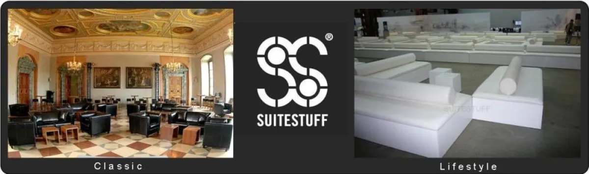 Mit Designlinien aus eigener Produktion sowie von ausgesuchten Partnern schafft SUITESTUFF ein glanzvolles Ambiente. Ob für ein Candlelight Dinner oder auf Großevents mit 2.500 Sitzplätzen. Es gibt unterschiedliche Design-Editionen, die drei Stilrichtungen enthalten: Business, Classic und Lifestyle und eine eigenständige Linie von Loungebars. Details, wie indirekte Beleuchtung bei Möbelstücken durch integrierte LED-Lampen in der gewünschten Farbe, sind genauso selbstverständlich, wie die Qualität, die in jedem einzelnen Möbelstück erkennbar ist.
