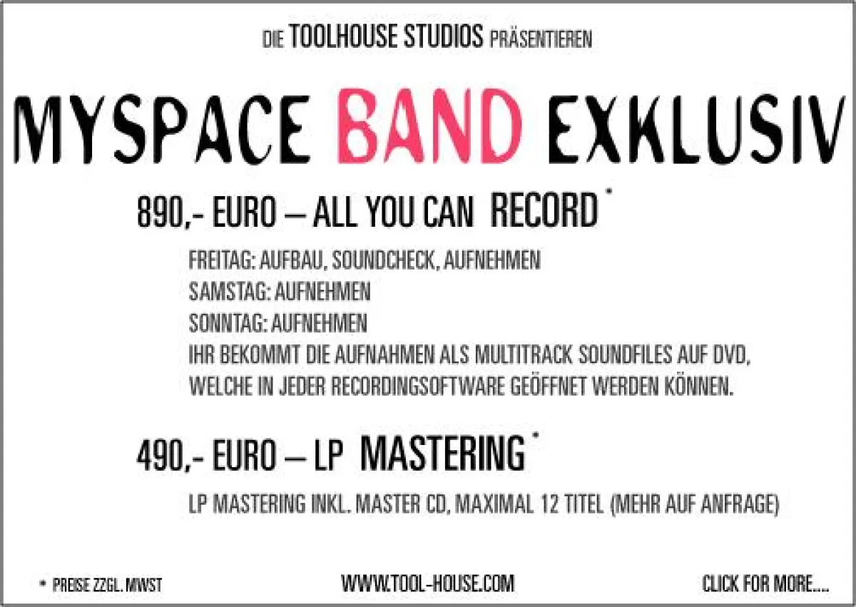 Sie lesen gerade: TOOLHOUSE Studios starten MYSPACE BAND EXKLUSIV Angebot