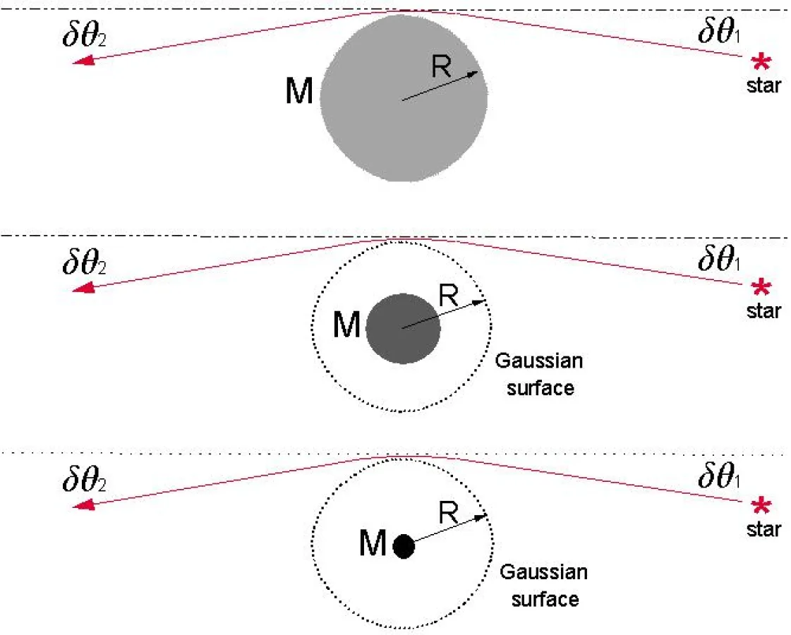 Das Gauß'sche Gesetz besagt, dass der Fluss des Gravitationsfeldes durch verschiedene, die gleiche Masse umschließende Oberflächen konstant ist; das heißt, dass Massen die einzigen Quellen der Feldlinien des Gravitationsfelds sind (siehe Abbildung). Dies zusammen mit dem Prinzip der Reziprozität ist Beweis, daß der Beobachter nicht kolinear mit Linse (nämlich der Massenkonzentration) und Quelle sein muss, um das von der Relativitätsprinzip vorhergesagte Gravitationslinsenereignis beobachten zu können. Auch in Abbildung, ist die Größe der Masse oder deren Umkreis nicht wichtig.
