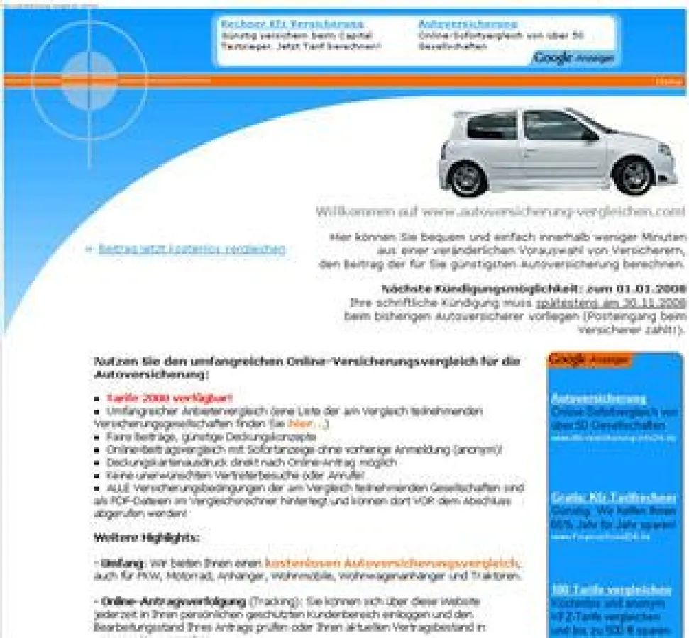 Auf der Website autoversicherung-vergleichen.com können interessierte Verbraucher einen kostenlosen Online-Versicherungsvergleich für Autoversicherungen abrufen. Eine umfangreiche Tarif- und Beitragsübersicht aller am Vergleich teilnehmenden Versicherungsgesellschaften wird sofort nach Eingabe der tarifrelevanten Angaben angezeigt. Eine vorherige Anmeldung ist nicht notwendig. Der Verbraucher hat somit nicht nur einen schnellen Überblick über eine Vorauswahl aktueller Autoversicherungstarife, es werden zusätzlich noch die wichtigsten Tarifmerkmale, sowie die zum jeweiligen Tarif gehörenden Versicherungsbedingungen angezeigt.