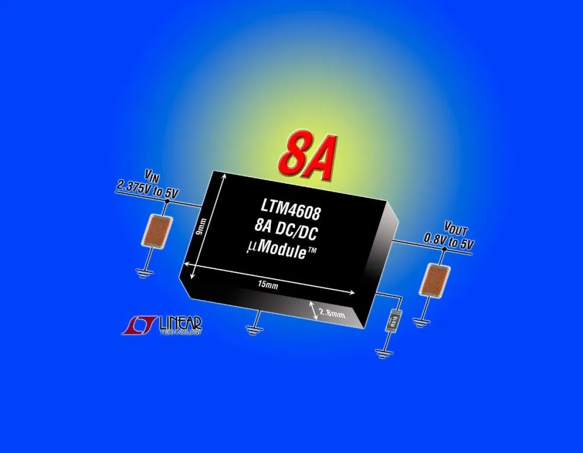 Das Modul LTM4608 akzeptiert eine Eingangsspannung im Bereich von 2,375V bis 5,5V (max. 6V) und liefert eine geregelte Ausgangsspannung zwischen 0,8V und 5V. Die komplette Schaltung ist in einem leichten (1,0g), 9mm x 15mm winzigen LGA-Gehäuse mit einer Höhe von nur 2,8mm untergebracht. Die kompakten Abmessungen, die flache Bauweise und das geringe Gewicht erlauben es, den LTM4608 auf die Rückseite einer Leiterplatte zu montieren und so auf der Vorderseite Platz für FPGAs, ASICs, Speicher- und sonstige ICs zu schaffen.