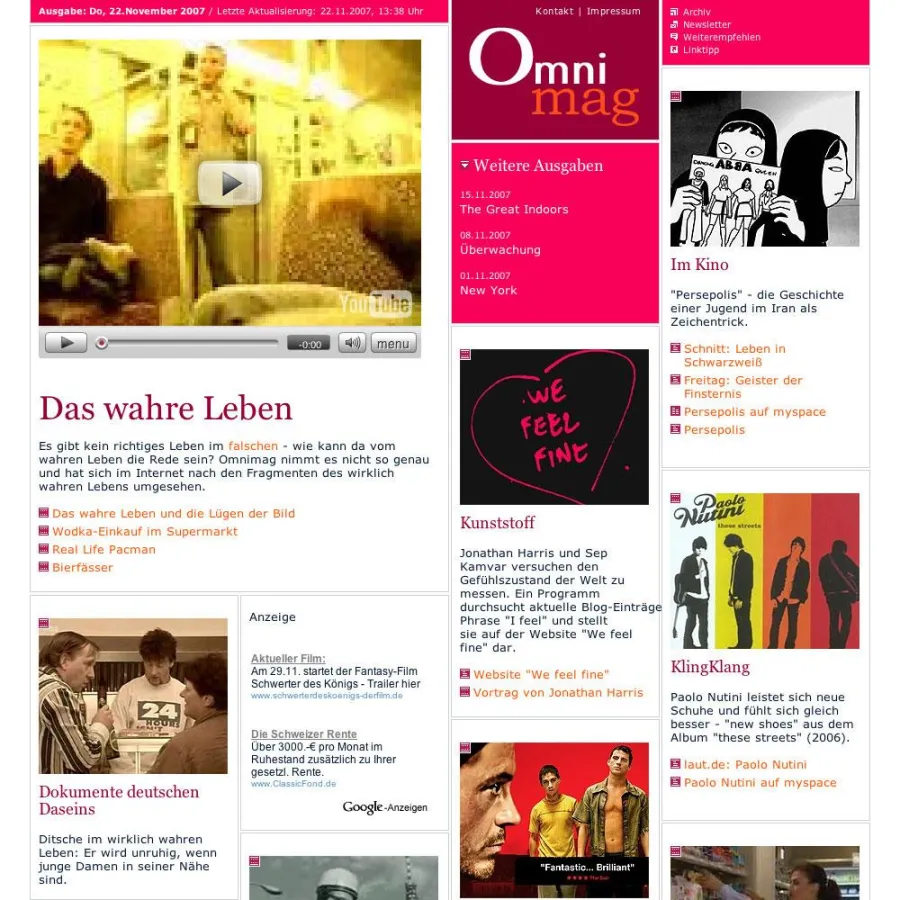 Sparen Sie Zeit beim Zeitvertreib! Verbringen Sie nicht länger ermüdende Stunden vor dem Bildschirm auf der Suche nach dem einen guten Clip. Omnimag erspart Ihnen viele Enttäuschungen. Omnimag sorgt für gute Unterhaltung. Einmal in der Woche durchforstet Omnimag das Netz für Sie und trägt die besten Fundstücke zu einem Thema zusammen. Omnimag erscheint …