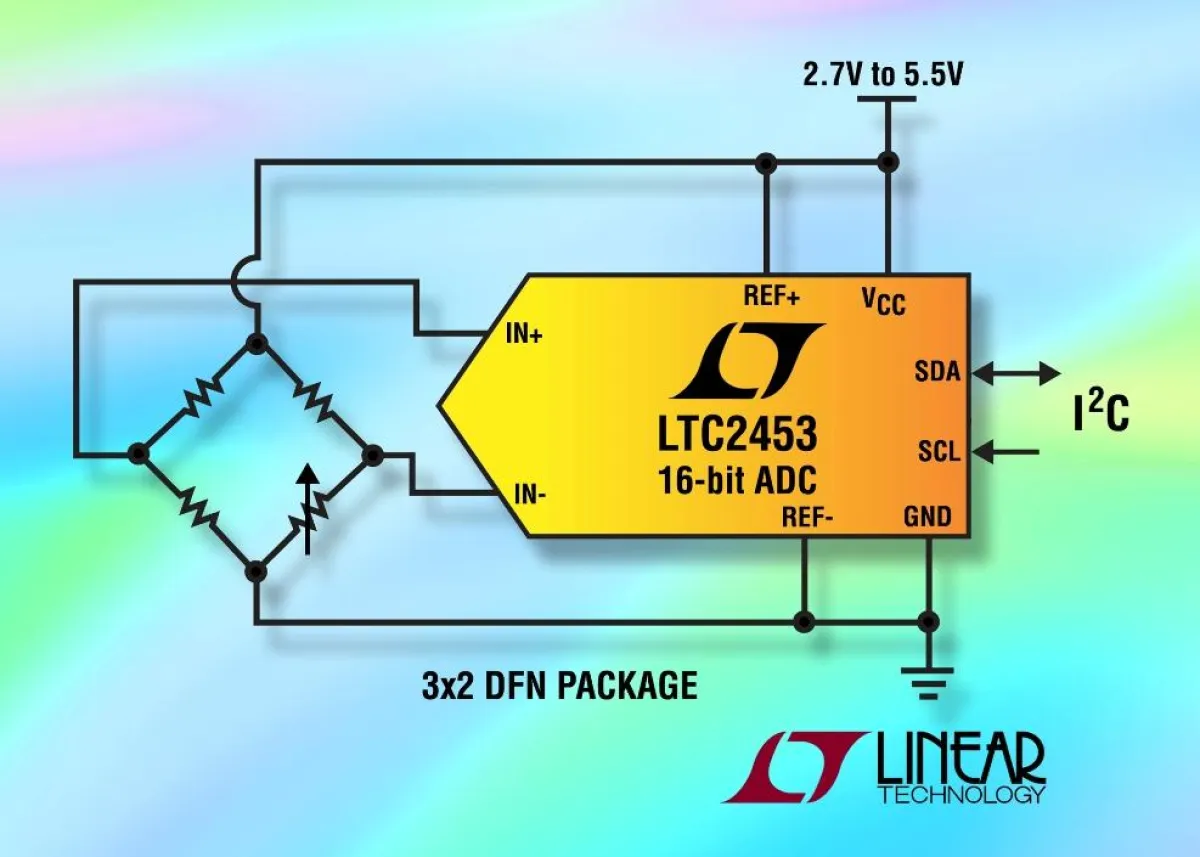 Der LTC2453 benötigt eine unipolare Betriebsspannung zwischen 2,7V und 5,5V und kann differenzielle Eingangsspannungen bis zu ±VCC verarbeiten. Durch den weiten Eingangsspannungsbereich eignet sich der Chip bestens zur Digitalisierung unsymmetrischer oder differenzieller Signale von Sensoren unterschiedlichster Art. Bei einer Grundfläche von nur 6mm2 bietet der LTC2453 eine Auflösung von 16bit und hervorragende Spezifikationen wie z. B. eine integrale Nichtlinearität von 2LSB, ein eingangsbezogenes Rauschen von 1,4uVeff und einen Verstärkungsfehler von 0,01%. Der interne Oszillator erlaubt bis zu 60 Umsetzungen pro Sekunde. Der Chip eignet sich dadurch bestens zur Digitalisierung der Ausgangssignale von Temperatur-, Druck-, Spannungs- und anderen Sensoren, die zur Messung langsam veränderlicher Größen verwendet werden.