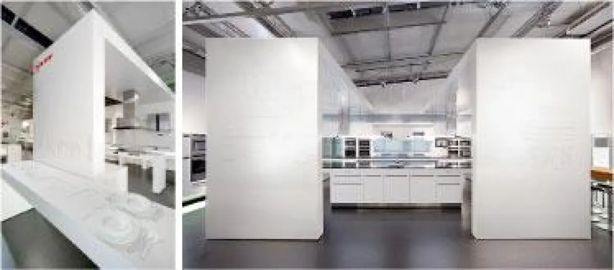 vielmehr ein Tisch, der die Einzelelemente zu einer harmonischen Einheit verbindet. Mit dieser Metapher wird für die gestalterisch anspruchsvollen Produkte der Neff GmbH eine optimale Einbausituation geschaffen, ohne gängige Küchenformen zu imitieren oder zu interpretieren. Die Münchner Niederlassung der Ludwigsburger Kreativagentur *av*communication war verantwortlich für die Entwicklung, die Konzeption und Gestaltung der Produktausstellung im ITC, ebenso für die gesamte Planung, die Bauleitung und die Abnahme des Projekts vor Ort.