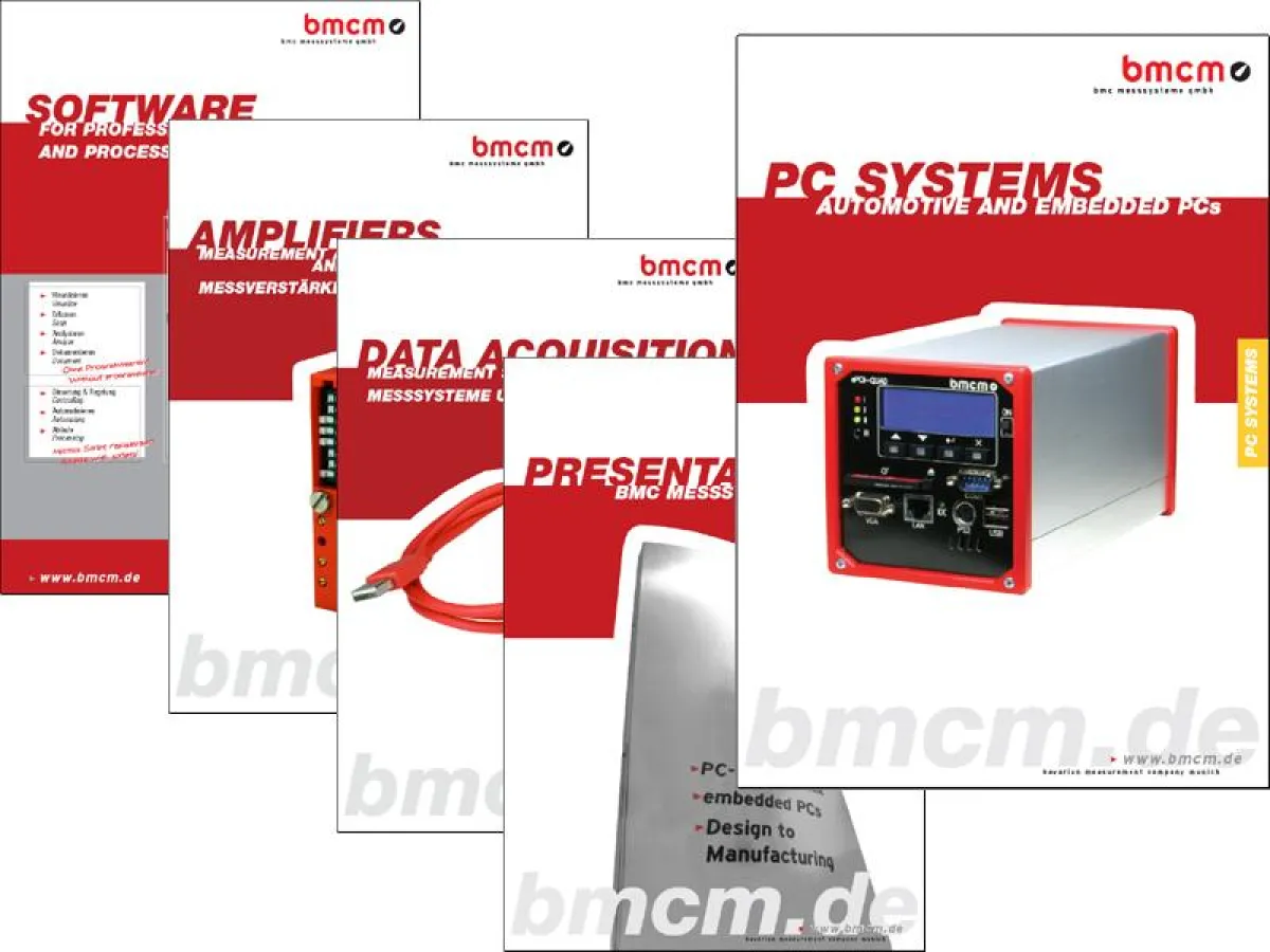 ) oder als PDF von der Website geladen werden (--> http://www.bmcm.de ). Zusätzlich stehen weitere Produktkataloge ("DATA AQUISITION", "AMPLIFIERS", "SOFTWARE"), sowie ein Firmenportrait ("PRESENTATION") zur Verfügung.