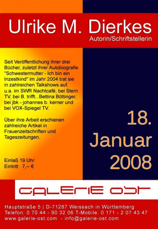 (openPR) Seit Veröffentlichung ihrer drei Bücher, zuletzt ihrer Autobiografie "Schwestermutter - Ich bin ein Inzestkind" (2004) war sie Gast in zahlreichen Talkshows, u.a. im SWR Nachtcafé, bei Stern TV, bei B. trifft ... Bettina Böttinger, bei jbk - johannes b. kerner und VOX-Spiegel TV. Über ihre Arbeit erschienen zahlreiche Artikel in Frauenzeitschriften und Tageszeitungen.