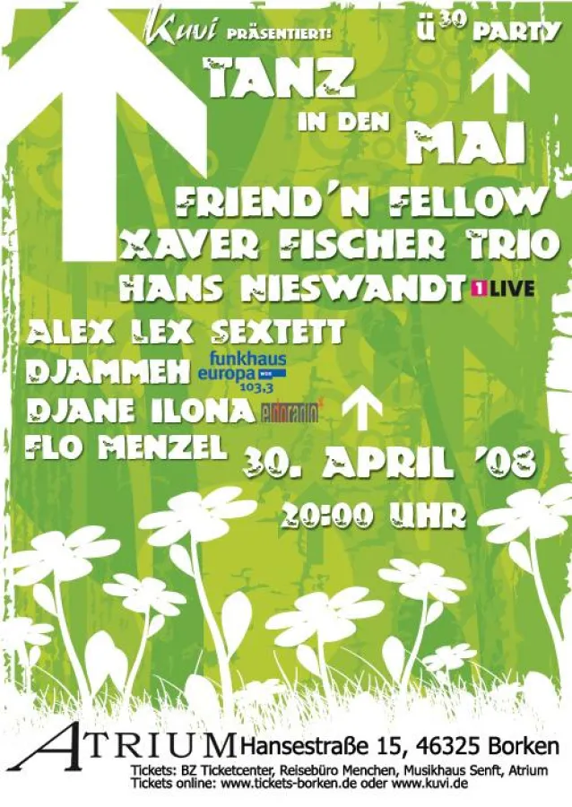 (openPR) Hochkarätige Bands und DJ's aus Jazz, Funk, Soul, House und Weltmusik treten bei der Tanz in den Mai ü30 - Party am Mittwoch, 30. April ab 20 Uhr auf zwei Bühnen im Borkener Atrium auf. Zwei Dj's und eine Djane sorgen für Partystimmung auf drei Tanzflächen.