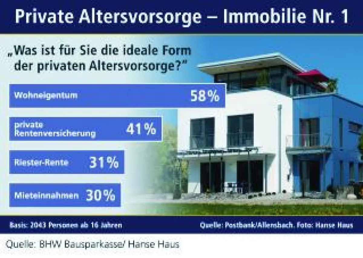 58 Prozent der Deutschen betrachten das eigene Haus oder die eigene Wohnung als ideale Form der Altersvorsorge, 30 Prozent wollen durch Vermietung ihre Alterseinkünfte optimieren. „Damit rückt die Immobilie als Altersvorsorge immer stärker in den Focus – auch unter Renditegesichtspunkten“, sagt Rüdiger Grimmert von der BHW Bausparkasse. Hier schneide die Immobilie zusammen mit Aktien am besten ab. „Die durchschnittliche jährliche Rendite einer 1970 getätigten Anlage in Aktien liegt bei 8,31 Prozent, die des Eigenheims bei 7,38 Prozent.“ Dabei könnte die Besteuerung der Dividenden und Zinserträge von Aktien den Abstand noch verringern. „Selbst genutzt oder als Kapitalanlage – die Immobilie gewinnt. Je besser ihr Zustand, desto höher ihr Wert – und Preis.“
